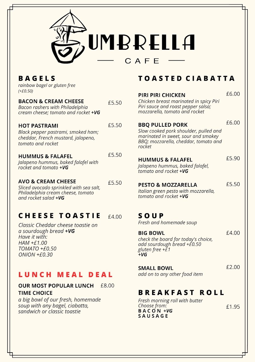 Welcome to Umbrella Cafe, a charming spot nestled at 150 Westmuir St, Glasgow. This delightful cafe boasts a menu filled with home-cooked comfort food, where every dish tells a story. Patrons rave about the Zapiekanka, a mouthwatering roll loaded with your choice of veggies, mushrooms, ham, or bacon, ideal for both dine-in and take-out. Their offerings extend to amazing bagels and hearty soups, perfect for a quick bite or leisurely meal.